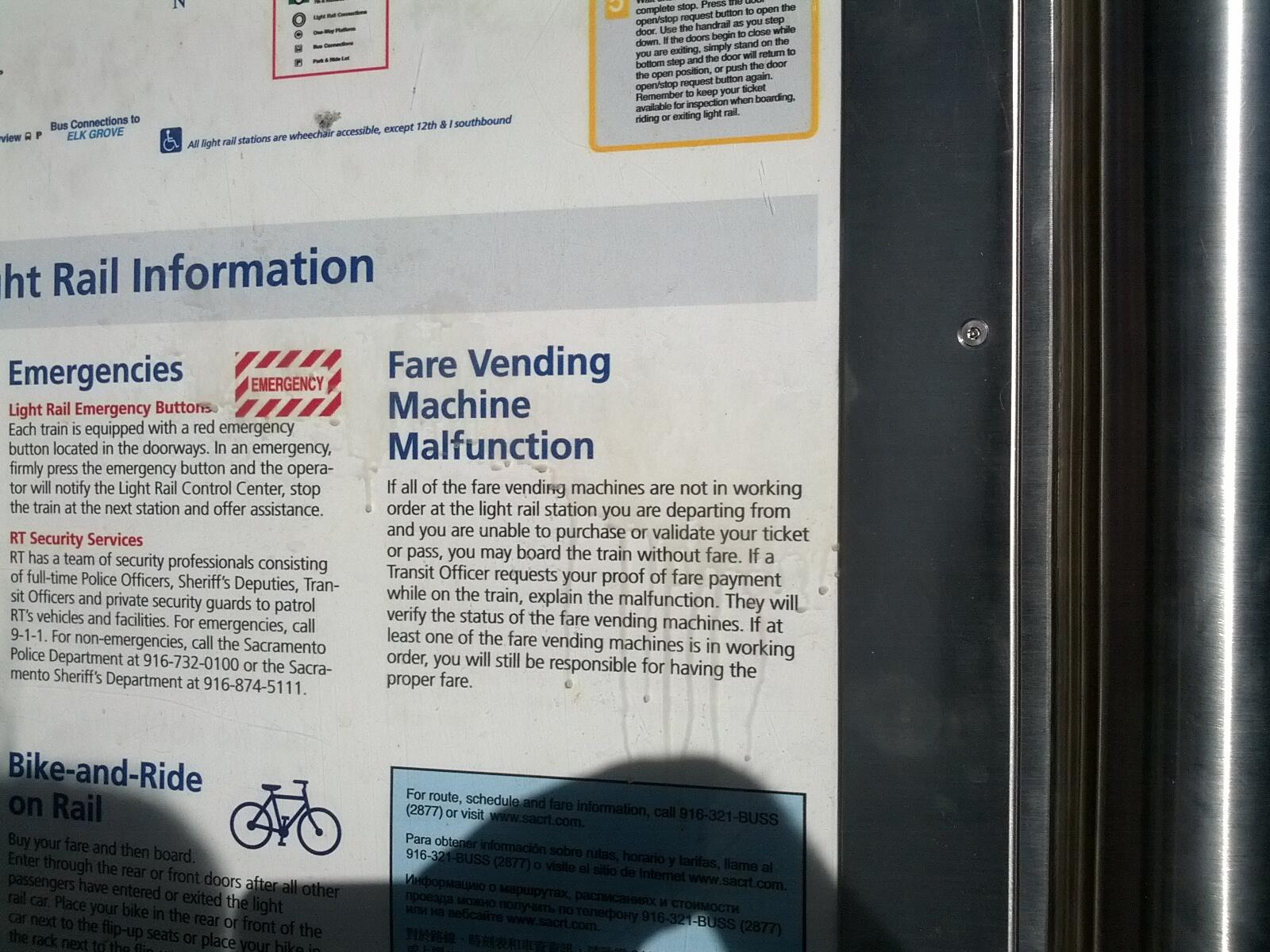 The arrogant Trimet executives expect riders to waste their personal Time by getting off at the next station to buy a ticket for light rail if all the TVM's at a station are broken. Its one of the most insulting examples of government tyranny I have ever witnessed. Riders can get a $175 if they don't follow that policy. What it means to riders is they miss the train they were on trying to purchase a new ticket. The picture below is the policy of another Transit district in California that actually is reasonable about TVM failure.